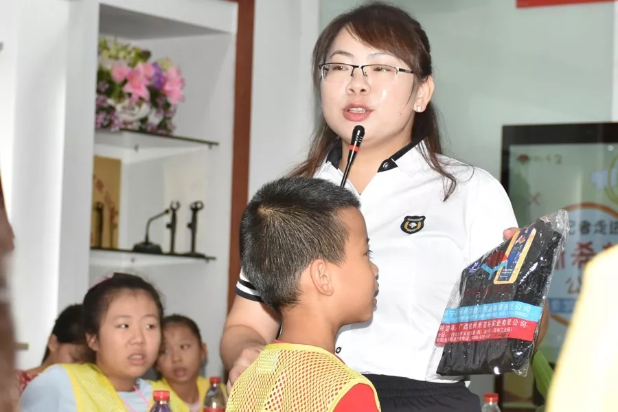 (新希望公司副總經(jīng)理莫麗江經(jīng)理為小記者們講解防偽標(biāo)識(shí))