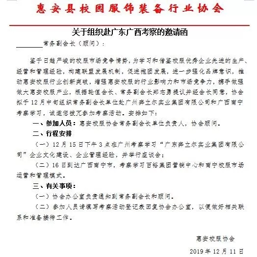 為學(xué)習(xí)和借鑒校服優(yōu)秀企業(yè)先進(jìn)的生產(chǎn)、經(jīng)營(yíng)和管理經(jīng)驗(yàn),構(gòu)建聯(lián)盟發(fā)展機(jī)制,促進(jìn)企業(yè)抱團(tuán)發(fā)展,進(jìn)一步強(qiáng)化品牌意識(shí),推動(dòng)惠安校服行業(yè)創(chuàng)新突破,增強(qiáng)惠安校服的行業(yè)影響力和市場(chǎng)競(jìng)爭(zhēng)力,攜手做強(qiáng)做大惠安校服產(chǎn)業(yè),12月15~17日,惠安縣校園服飾裝備行業(yè)協(xié)會(huì)會(huì)員單位赴廣東、廣西進(jìn)行考察交流活動(dòng)。活動(dòng)期間先后考察廣東奔立爾集團(tuán)、廣東雅藝服飾、百裕集團(tuán)