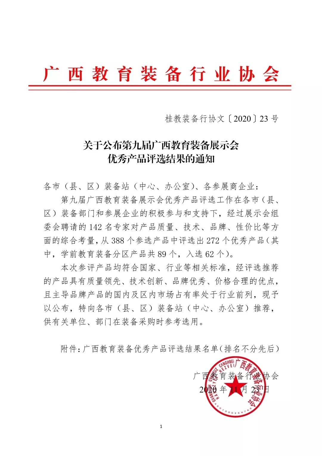 第九屆廣西教育裝備展示會(huì)優(yōu)秀產(chǎn)品評選工作在各市(縣、區(qū))裝備部門和參展企業(yè)的積極參與和支持下,經(jīng)過展示會(huì)組委會(huì)聘請的142名專家現(xiàn)場對參賽產(chǎn)品質(zhì)量、技術(shù)、品牌、性價(jià)比等方面的綜合考量,從388個(gè)參選產(chǎn)品中評選出272個(gè)優(yōu)秀產(chǎn)品。