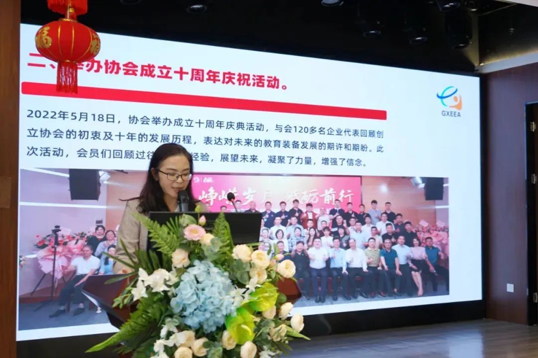 張珊會(huì)長(zhǎng)對(duì)協(xié)會(huì)2022年工作情況進(jìn)行了總結(jié)匯報(bào)。2022年協(xié)會(huì)密切關(guān)注國(guó)家大事,堅(jiān)定不移與黨中央保持高度一致,組織協(xié)會(huì)會(huì)員企業(yè)集中學(xué)習(xí)黨的二十會(huì)議精神。在新冠疫情的大環(huán)境下,舉辦協(xié)會(huì)成立十周年慶典活動(dòng),成功舉辦第11屆廣西教育裝備展示會(huì),成立協(xié)會(huì)專家組,與廣西標(biāo)準(zhǔn)化協(xié)會(huì)簽訂發(fā)展戰(zhàn)略合作協(xié)議,同時(shí)積極吸收優(yōu)質(zhì)會(huì)員企業(yè),開展各種研討培訓(xùn)、展示交流、參觀考察、公益捐贈(zèng)等活動(dòng),在會(huì)員的共同努力下,向行業(yè)向企業(yè)交出了一份滿意的答卷。