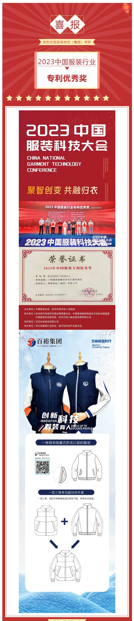 喜報(bào) I 百裕世紀(jì)(集團(tuán))榮獲 2023中國服裝行業(yè)專利優(yōu)秀獎(jiǎng)