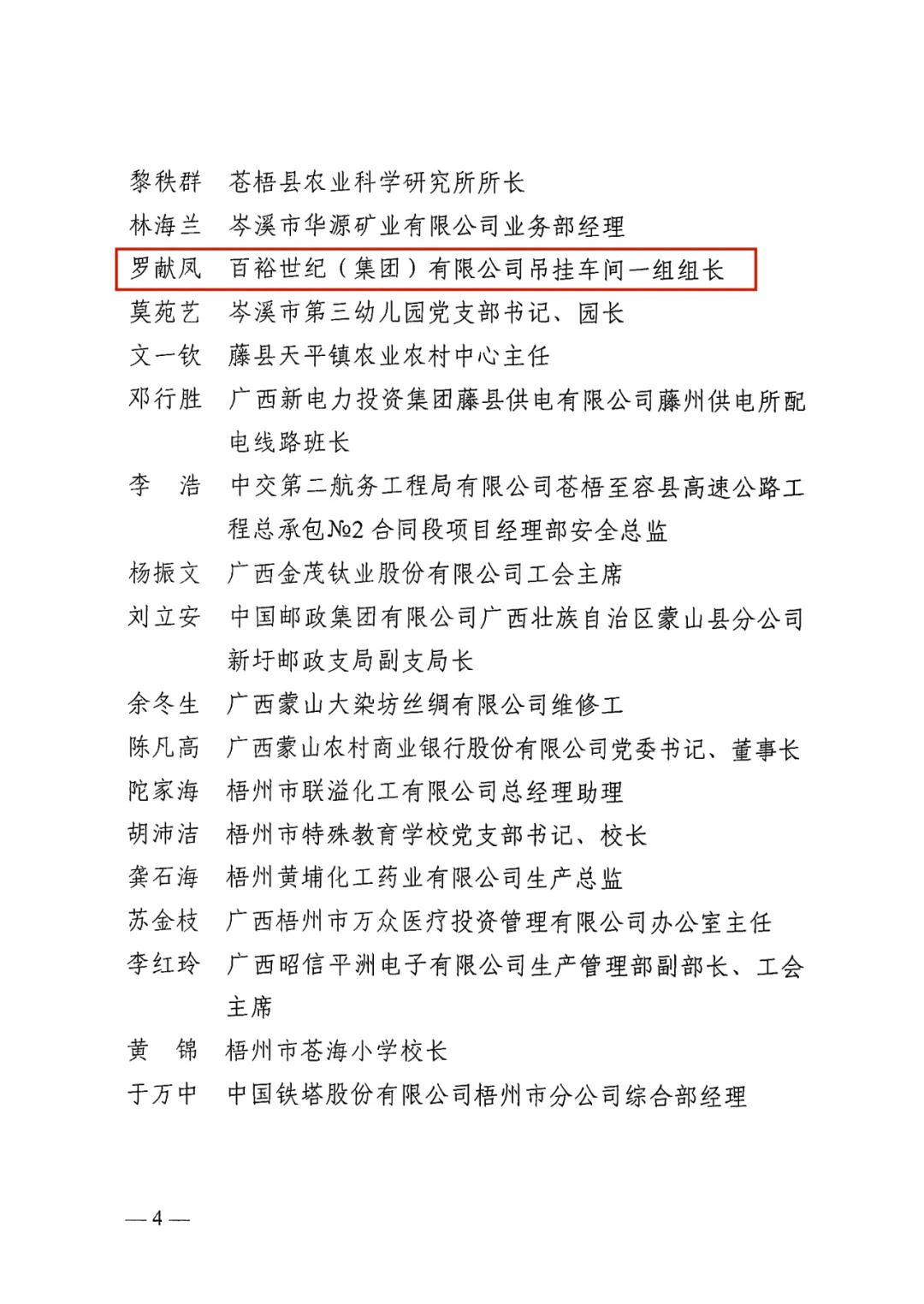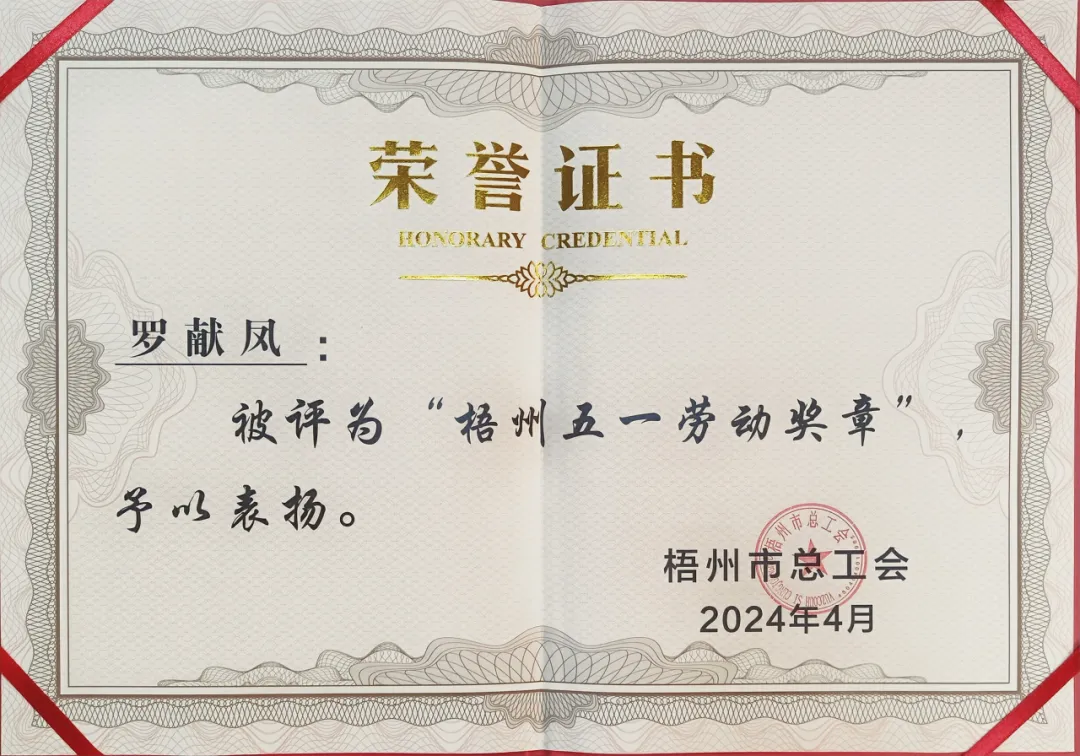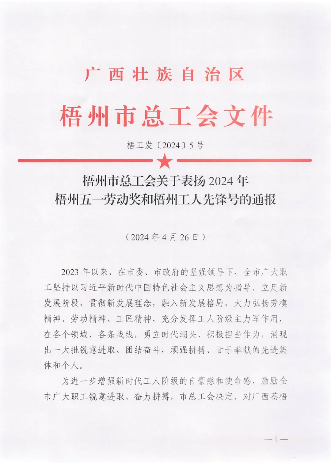 4月26日,梧州市總工會(huì)印發(fā)《梧州市總工會(huì)關(guān)于表?yè)P(yáng)2024年梧州五一勞動(dòng)獎(jiǎng)和梧州工人先鋒號(hào)的通報(bào)》,百裕世紀(jì)(集團(tuán))有限公司羅獻(xiàn)鳳同志榮獲2024年“梧州五一勞動(dòng)獎(jiǎng)?wù)隆薄?/span>