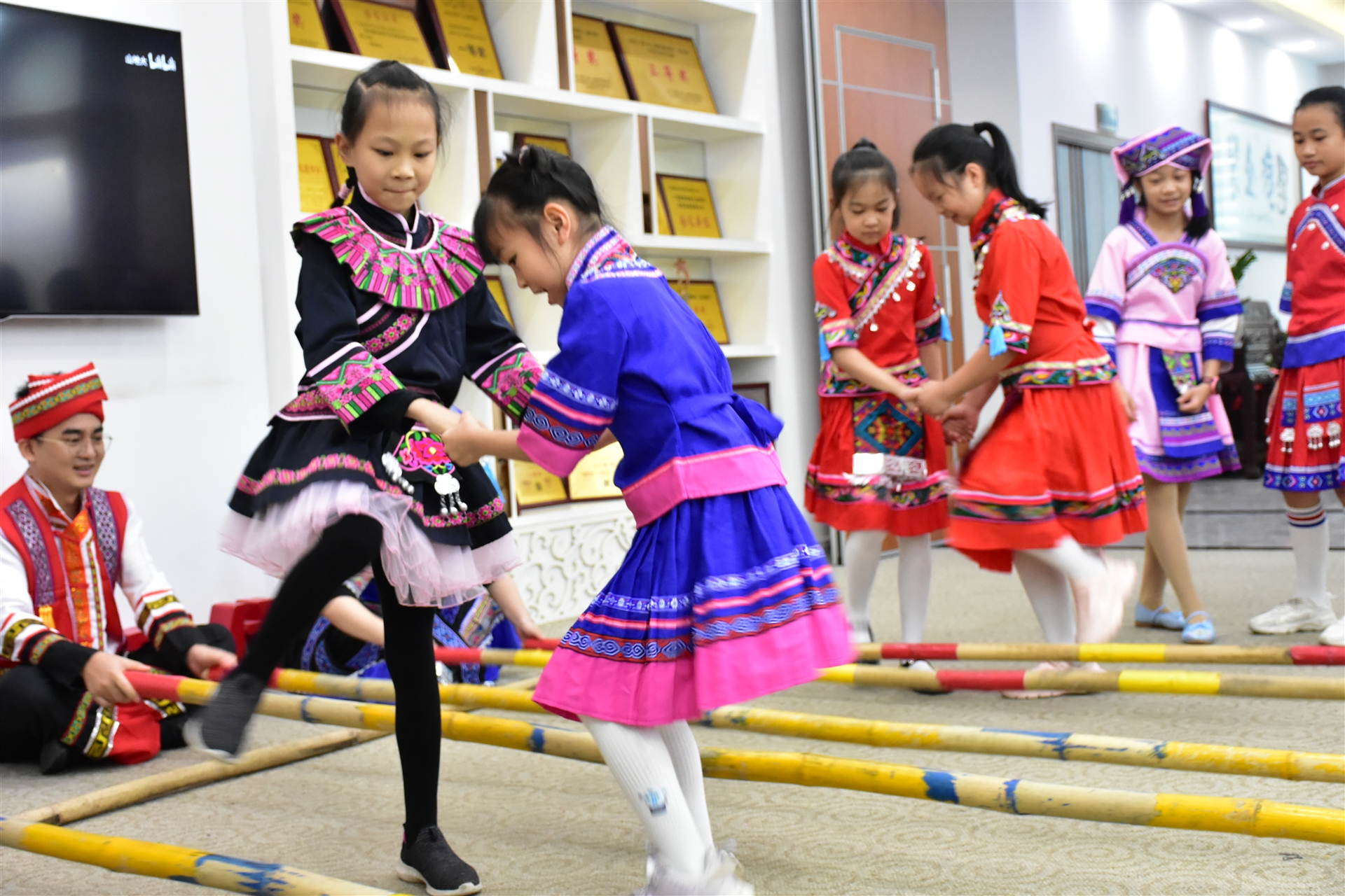 跳進去,跳出來;小竹竿,動起來......伴隨著竹竿清脆的敲擊聲,孩子們依次跳過竹竿陣,體驗節(jié)日的歡樂及感受壯鄉(xiāng)的民族風(fēng)情。