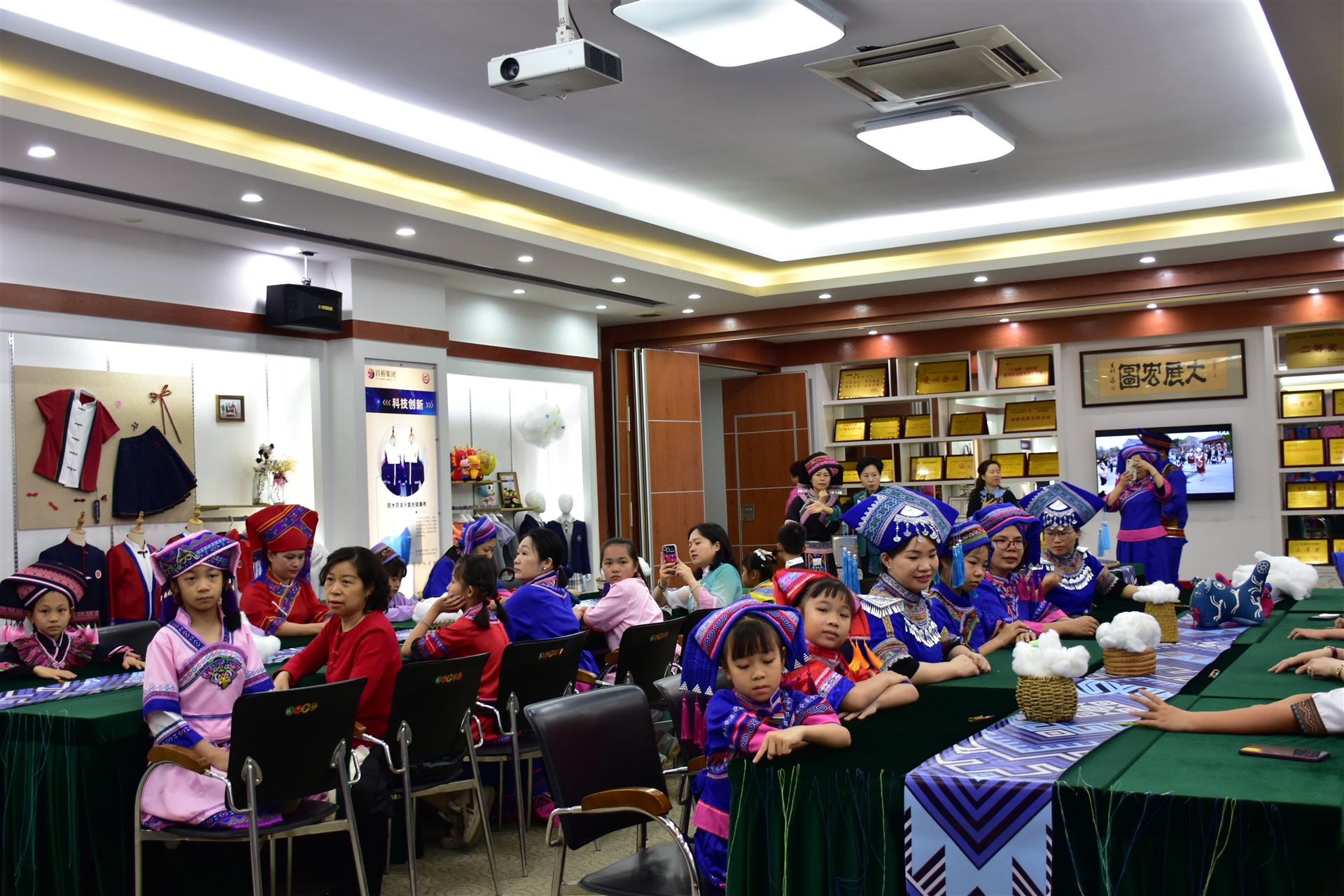 隨后,非遺老師向大家介紹了融入民族元素的校服,具有民族特色的手工藝品以及制作繡球的流程、技巧。